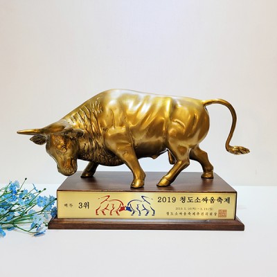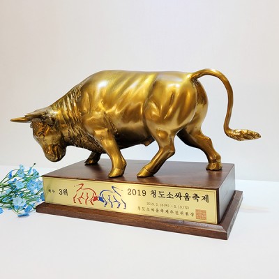 소의 역동적이고 강한 힘이 느껴져 소싸움대회때 꾸준히 찾는 청동 황동 황소상패 상품입니다.