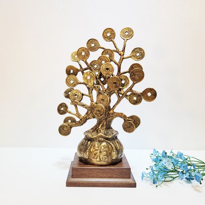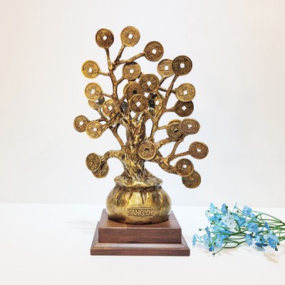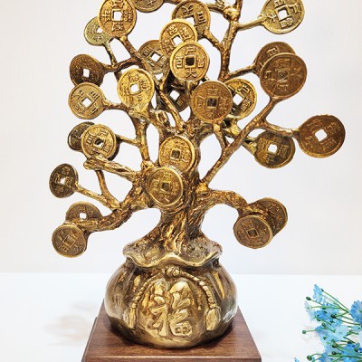 재물운을 부르는 청동 황동 공예품인 돈나무 복주머니 조각품은 복을 부르는 복주머니 위에 하나하나 수작업으로